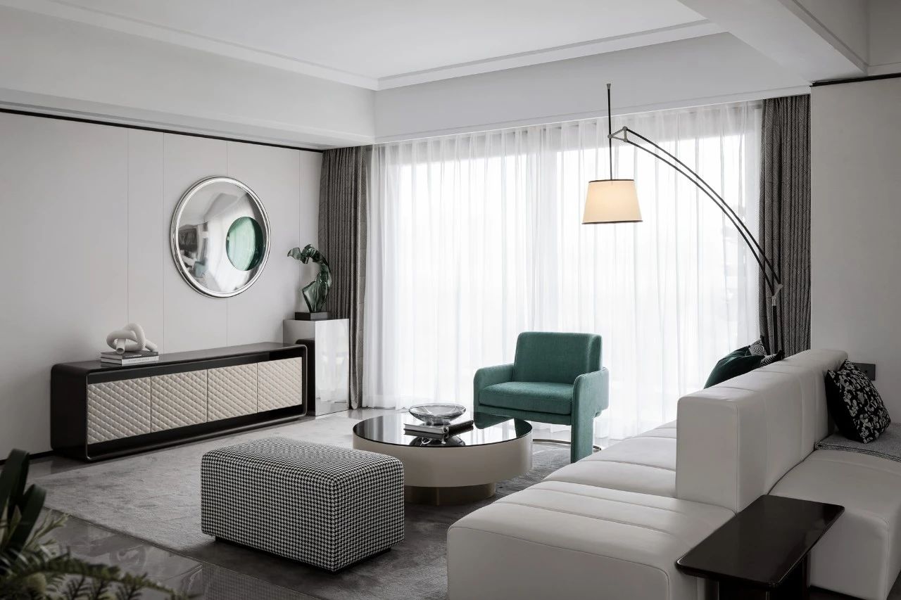 自然光线投射出的暖意与恰到好处的空间陈设,氤氲家的宁静与温馨。纯色沙发,圆形茶几,搭配颇具设计感的灯饰,动感与秩序之美呼之欲出。