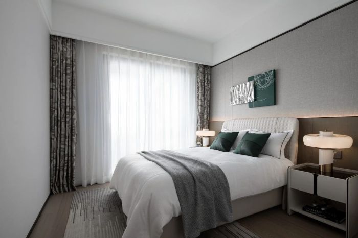 主卧空间配色素雅,极为克制。承接总体空间设计规范, 几抹墨绿让心灵得以收获片刻的慰藉与愉悦。