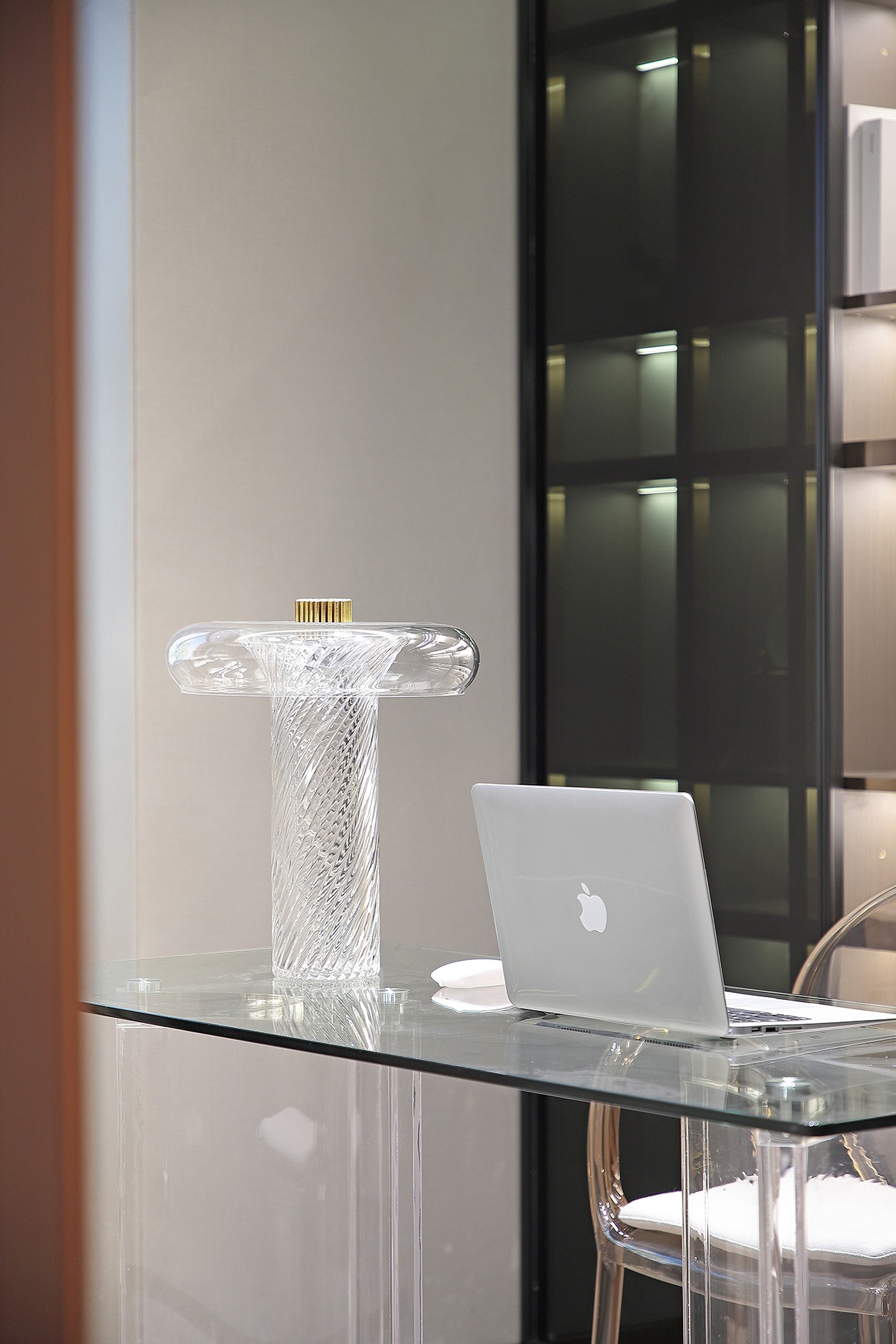 以透明的书桌为空间主体,在黑色与金属色的调和点缀下,