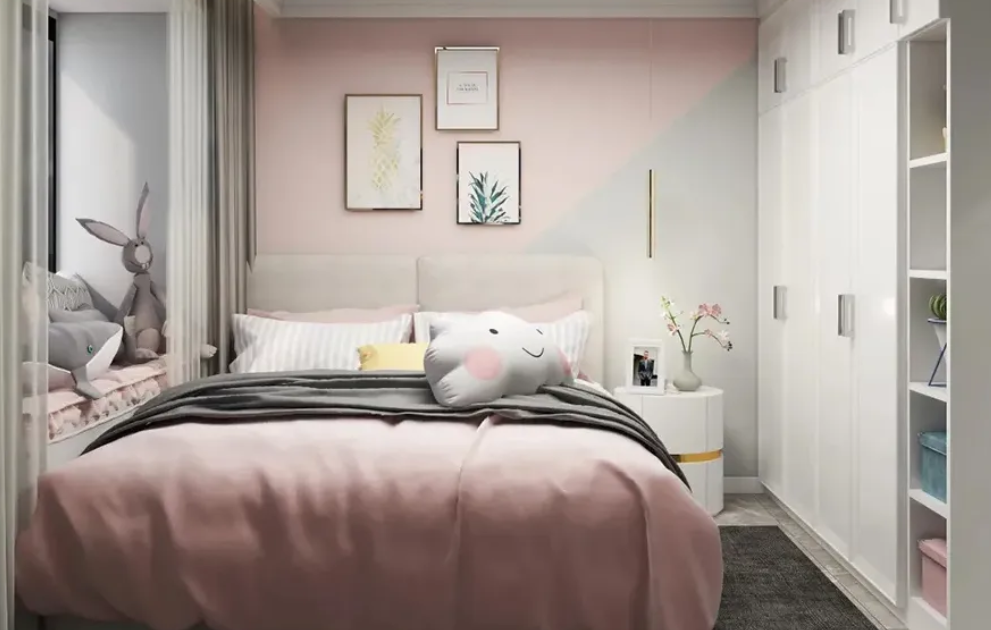 这个儿童房设计我们选择了粉色的床单、粉白色床头、暖木色和金色的书桌装饰等,这种明亮的色彩不仅让空间更加活泼,也符合儿童天真烂漫的性格,创造了一个安全、舒适、充满童趣的成长空间。